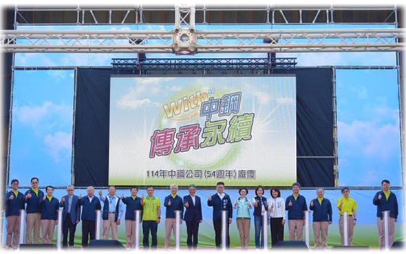 中鋼成立54週年廠慶活動,於114年12月13日假中鋼公司小港廠行政區辦理,以「WITH(54)中鋼,傳承永續」作為活動主軸,董事長重申中鋼將以主動行動守住市場、以轉型強化競爭力,持續為臺灣產業與未來發展打造穩固根基,勉勵全體同仁團結,守設備、盯成本、攻市場、推轉型、做研發、精製程,共創永續價值。本次廠慶安排精彩舞台表演,熱絡氣氛,活動會場還設置同仁趣味競賽、36攤美食園遊會、街頭藝人表演、兒童氣墊樂園、親子闖關遊戲、大型聖誕裝置藝術打卡站、退休員工回娘家服務站,大禮堂大廳有19個社團以逗趣展演、試吃試喝與互動遊戲等創意,積極招攬新血,現場氣氛熱烈、歡笑聲此起彼落;此外還有深受員眷喜愛的廠區巴士巡禮及史蹟館參觀活動,藉由一年一度廠慶活動,讓同仁與家人一同歡聚交流,共享假日休閒時光。是日共計約5,500名員眷參與。本公司另於12月15日假福利餐廳辦理福委會年終摸彩活動,感謝同仁整年打拼的辛勞。