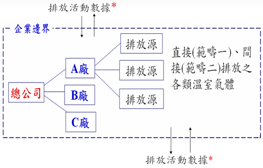 以Bottom-up方式清查排放源后,以Top-down精神加总成一组排放活动数据(跨越组织边界)的示意图 |