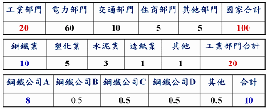 (2)数据交叉比对:国家在范畴一之能耗数据若与钢铁公司A及其他组织一致(如下表),并统一采用IPCC盘查方式及相似的CO2排放系数,则组织层级的盘查结果向上加总后会与国家盘查结果一致,不致有落差及困扰。 |