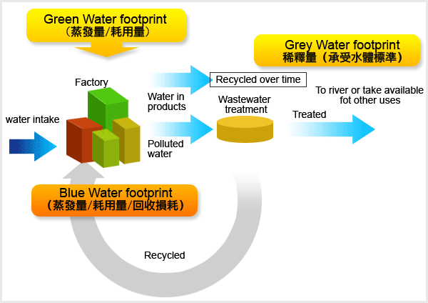 产品水足迹 = 绿色水足迹 + 蓝色水足迹 + 灰色水足迹
