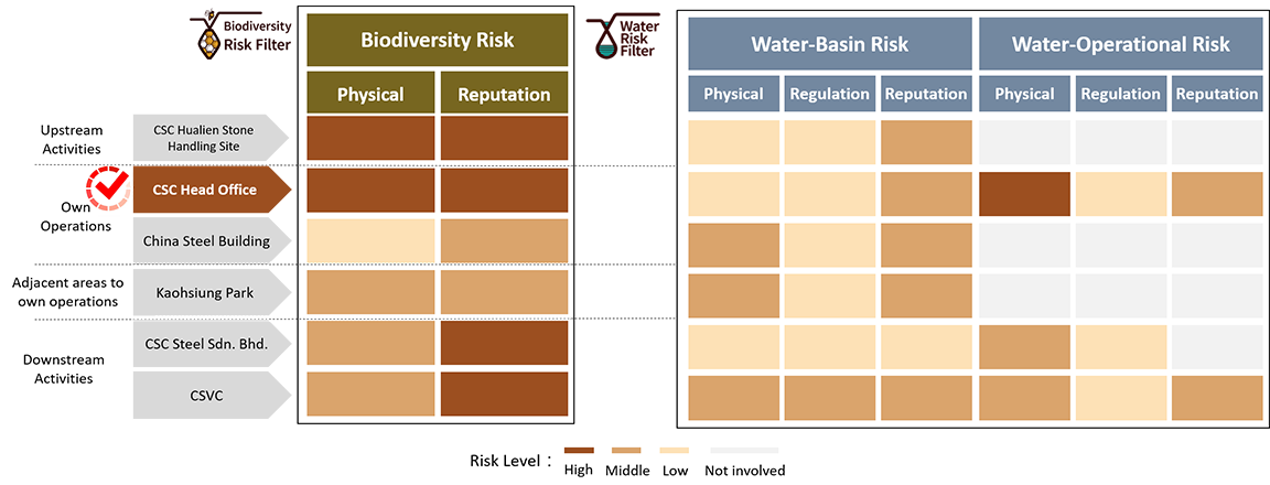 The Head Office and Hualien Stone Handling Site are identified as priority areas based on the result of biodiversity risk assessment, while the head office is identified as a priority area based on the result of water risk assessment. Therefore, CSC combined the cross-comparison results and decided to select the head office as the priority area.