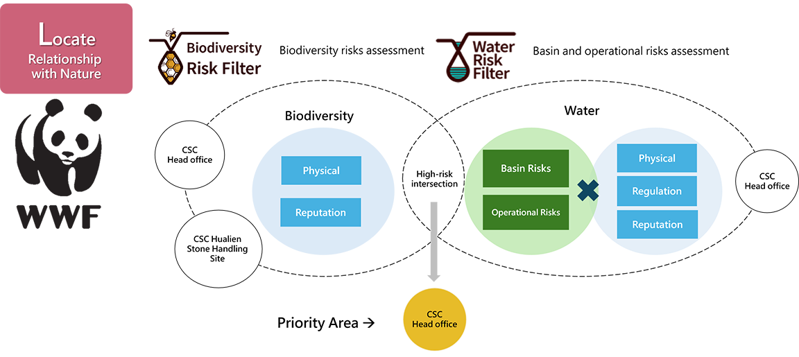 CSC applied the WWF Biodiversity Risk Filter and the WWF Water Risk Filter to analyze the risk of the value chain. Based on the cross-comparison of risk results, those locations that fall into the high-risk range of both biodiversity risk and water risk are identified as priority areas.