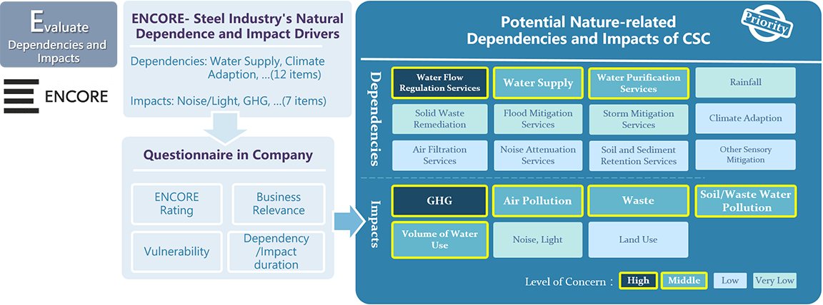 Based on the ENCORE framework, CSC identified the primary nature-related dependencies and impact drivers relevant to the steel industry, with the Head Office selected as the priority site for evaluation. A questionnaire survey was then conducted, inviting members of the TNFD task force to assess each driver in terms of business relevance, vulnerability, dependency, and duration of impact.