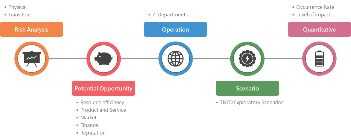 CSC adopted the SBTN action framework, systematically identifying and responding to natural impacts through the four major actions of “Avoid, Reduce, Regenerate, and Restore". At the same time, CSC used the four steps of ACT-D (Assessment, Transformation, Commitment, and Disclosure) to review the implementation of nature-related opportunities and gradually build internal management and disclosure mechanisms. Through science-based strategic actions and risk scenario analysis, CSC strengthens our resilience to natural risks and actively deploys emerging market opportunities under the green transformation.
