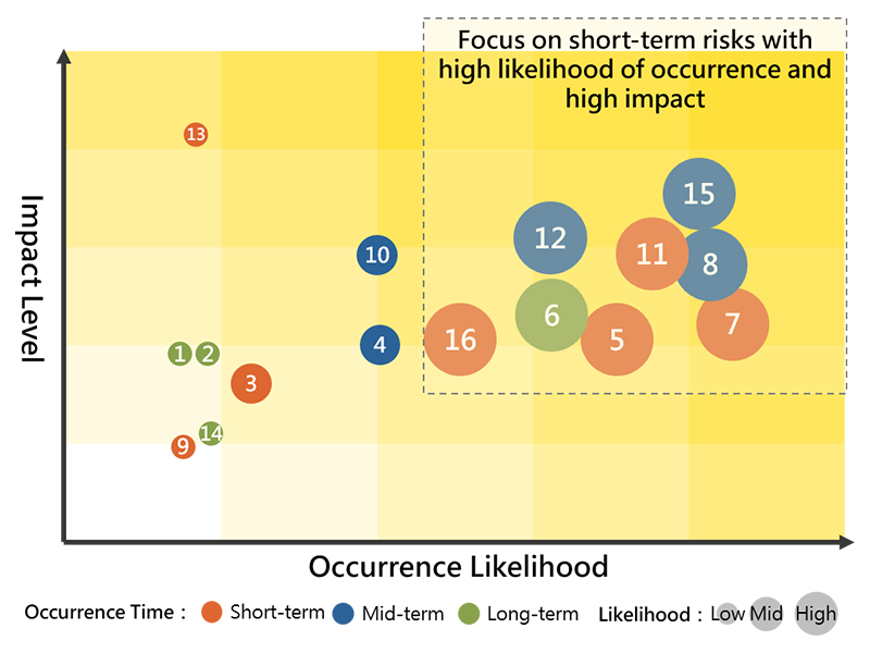 Based on the results of the scenario analysis, CSC identified the significance of 16 risk topics. Among them, the material risk topics include green finance transformation, international sustainability trends, nature-related laws and policies, regulatory uncertainty, international carbon reduction trends and pressures, and reputational risks.