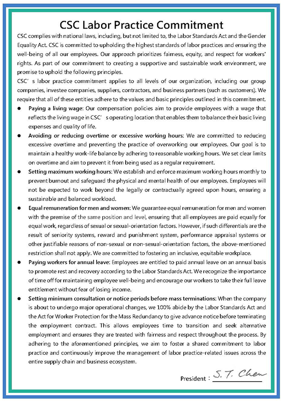 To promote sound labor relations, CSC holds labor-management meetings monthly—exceeding the minimum quarterly requirement. Additionally, each plant or department organizes communication meetings with employees every two to three months to gather feedback and collaboratively address issues. Collective agreements with the Labor Union, covering 100% of full-time employees, are reviewed every three years to uphold fair and reasonable labor conditions.